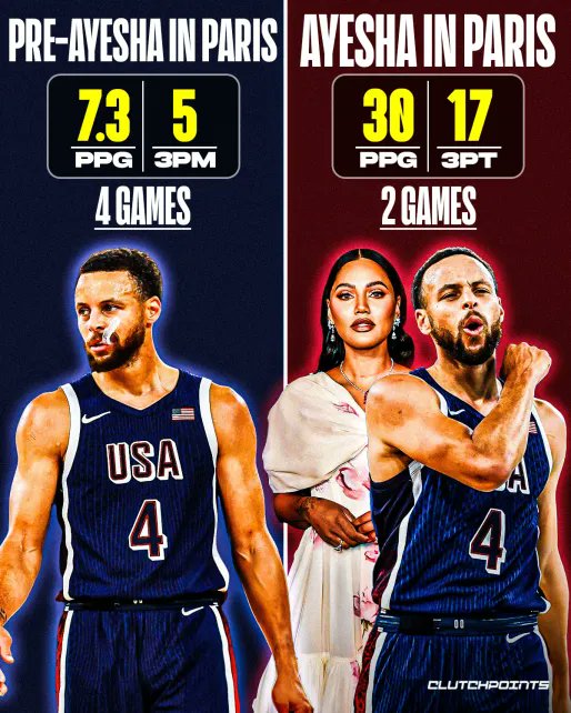 美媒ClutchPoints晒图,阿耶莎来到巴黎前,库里场均只拿到7.3分,而且4场比赛总共投进5记三分;阿耶莎来到巴黎后,库里场均30分,2场比赛总共投进17记三分,配文调侃:阿耶莎是拯救斯蒂芬·库里和美国队的无名英雄。