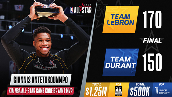詹姆斯队:阿德托昆博35分7篮板3助攻,库里28分4篮板4助攻2抢断,利拉德32分2篮板,保罗6分8篮板16助攻3抢断,乔治17分2篮板2助攻,布朗22分5篮板2抢断,戈贝尔10分7篮板,詹姆斯4分2篮板4助攻,约基奇6分7篮板5助攻,东契奇8分3篮板8助攻。