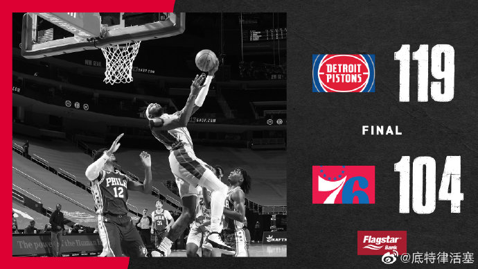 24直播网1月26日讯 NBA常规赛活塞对阵76人,活塞近来状态不佳遭遇4连败,76人则是在3连胜后暂时登顶东部榜首,但是恩比德这场比赛继续缺阵。开场后活塞在外线就展现出火热手感,他们连续投进三分早早取得两位数优势,第二节76人掀起反扑缩小分差,活塞通过罚球再次拉开比分,艾灵顿和库里对飚得分,上半场活塞64-50领先。下半场回来格兰特连续投篮命中,哈里斯也接连得分回应,布拉德利也通过努力拼抢为76人追分,但活塞总能及时命中三分稳住节奏,76人始终无法追上比分,最终活塞119-104击败76人结束4连败。