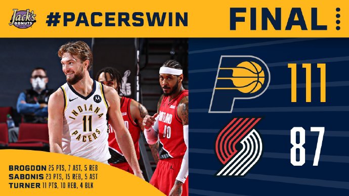 24直播网1月15日讯 NBA常规赛开拓者主场迎战步行者,开拓者近来状态火热取得4连胜。开场后两队你来我往就呈现胶着局面,首节两队打成平手,第二节开拓者进攻突然断电单节仅拿到10分,步行者则是全队轮番发力多次打出攻势将比分拉开,上半场步行者59-36大比分领先。下半场回来利拉德和麦科勒姆渐入佳境带领开拓者逐渐缩小分差,但第四节萨博尼斯内线发挥出色不断砍分,开拓者自己没能延续攻势,最终步行者111-87轻松终结开拓者4连胜。