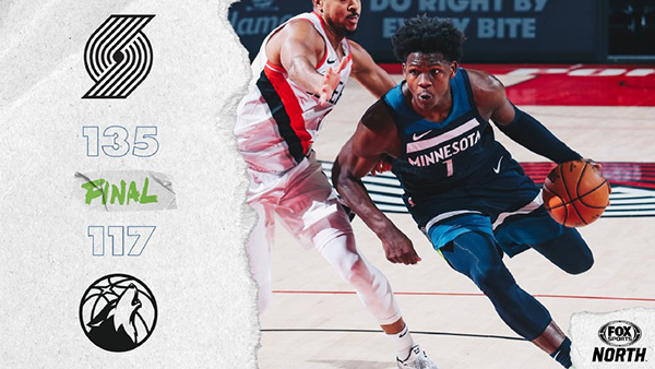 24直播网1月8日讯 NBA常规赛,开拓者今日迎战森林狼,前者两连败后下滑至西部第八位,而后者更是惨遭五连败西部垫底。比赛上来拉塞尔连续得分帮着森林狼取得领先,但调整过后的开拓者逐渐追上比分,次节更是利用一波攻势拉开分差,半场结束时开拓者领先19分。易边再战,森林狼没有找到限制对手的办法,场上分差已经突破了三十分,末节森林狼虽然将分差缩小到十几分,但终究没能获得逆转比赛的机会,最终开拓者大胜森林狼,送给后者六连败。