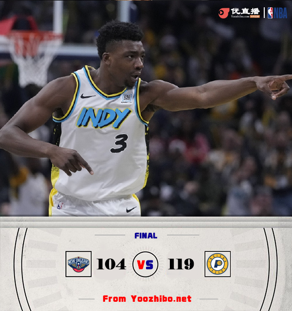 24直播网讯12月16日讯 NBA常规赛,步行者主场迎战鹈鹕,步行者目前11胜15负排名东部第8,鹈鹕则是3连败后5胜21负西部垫底。本场比赛,锡安和英格拉姆继续缺阵。比赛开始,鹈鹕反客为主打出8-2开局,但步行者接连走上罚球线回应12-0攻击波反超比分,随后鹈鹕全民皆兵追分,首节步行者领先3分,次节步行者依靠替补上来8-1领先到双位数,双方命中率都有下降,哈利伯顿三分连续命中,步行者10-0再次在半场领先到17分。下半场,哈利伯顿发力三分加接连抢断反击砍下7分,步行者拉开20分以上领先,随后琼斯和穆雷三分止血,双方围绕20分左右分差展开对攻大战,末节鹈鹕又是近3分钟没有运动战得分,但随后调整状态一度追到11分,哈利伯顿一攻一传稳住局势,最终步行者119-104轻取鹈鹕,送对手4连败。
