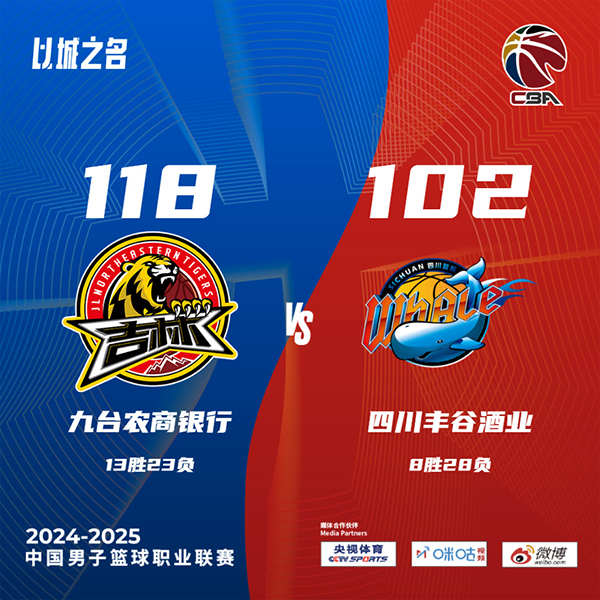 24直播网讯北京时间3月5日讯 CBA常规赛战火重燃,吉林坐镇主场迎战四川,四川目前8胜27负排在联赛第17位,吉林12胜23负位列第14。此役一上来双方早早进入状态陷入僵持,琼斯连续取分对飚萨姆纳,首节结束时吉林领先2分,次节回来,双方延续火力拉开对攻,萨姆纳联手亨特不断打进,但基兹林克单节狂揽20分强势回应,半场战罢,吉林确立10分优势。短暂休整后王薪凯连中三分掀起反扑号角,四川多点开花蚕食分差,三节结束后吉林仅领先1分,末节决战,四川进攻彻底断电,吉林延续火力终结悬念,最终吉林118-102击败四川送对手7连败。
