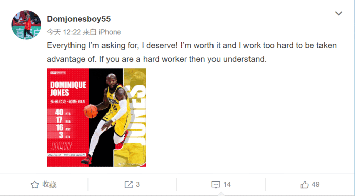 其一是来自于吉林外援多米尼克·琼斯,这位小外援在个人社媒上公开炮轰管理层“我所要求的一切,都是我应得的!我值得这一切,并且我工作努力,就为了不让别人占了我的便宜。如果你是一个努力工作的人,那你就会理解。别再违背承诺了!我只想被公平对待。我付出过血汗泪,这样要求很过吗?”