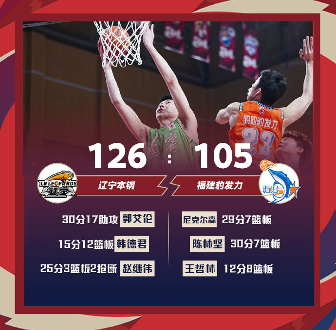 辽宁126-105战胜福建 郭艾伦30+17 张镇麟20分 陈林坚30+7