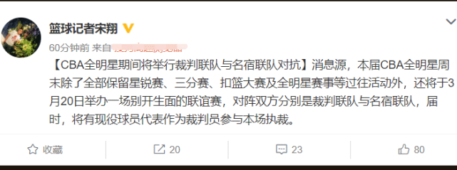 宋翔写道:本届CBA全明星周末除了全部保留星锐赛、三分赛、扣篮大赛及全明星赛事等过往活动外,还将于3月20日举办一场别开生面的联谊赛,对阵双方分别是裁判联队与名宿联队。届时,将有现役球员代表作为裁判员参与本场执裁。
