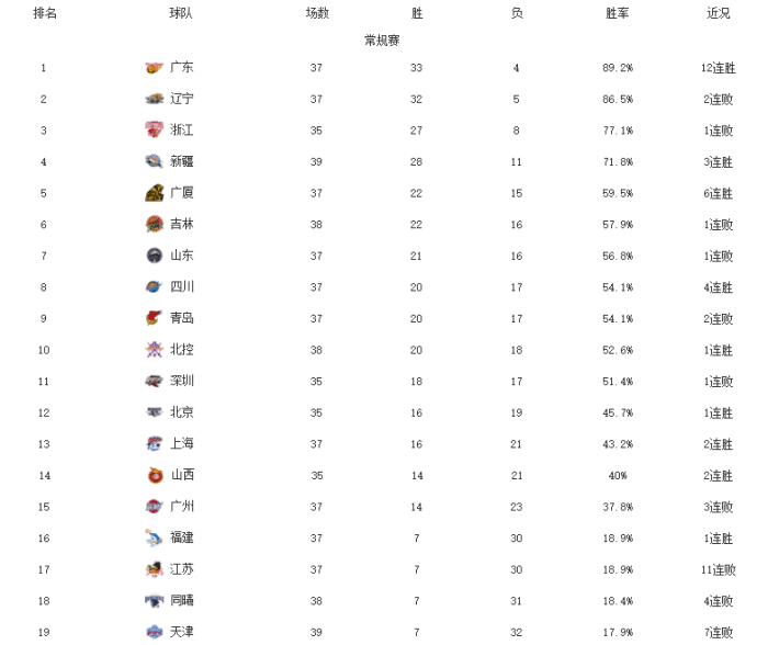 现在CBA的战绩榜上,卫冕冠军广东以12连胜,33胜4负的战绩高居第一名。辽篮32胜5负位居第二名;浙江男篮和新疆男篮位居身后,7连败的天津男篮以7胜32负垫底。