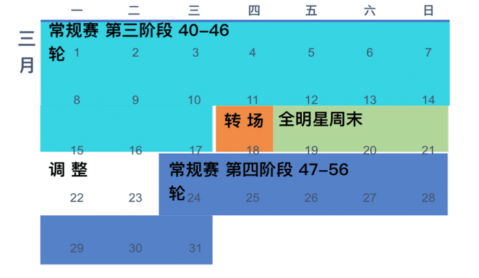 方案一:3月1日开打,3月19-21日举办全明星赛,3月24日开始第四阶段的比赛。
