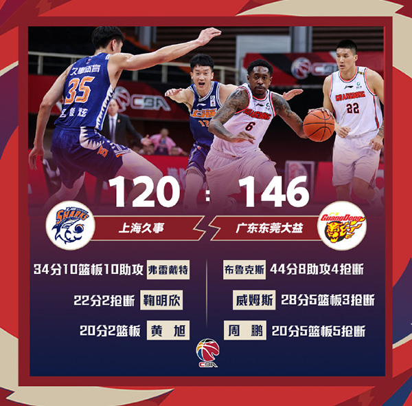 末节,弗雷戴特投进三分,上海队连得5分落后8分。周鹏上篮得分,随后弗雷戴特再进三分,上海队110-115落后打停广东队。威姆斯上篮得分并造犯规,广东队打出一波流领先11分。在鞠明欣2罚全中后,胡明轩连续砍分,广东队很快将领先优势扩大至20+。布鲁克斯投进三分,终场前1分多钟上海队落后24分,比赛失去悬念。