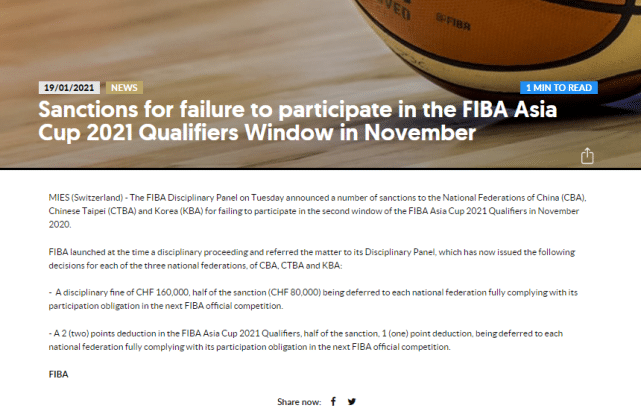 需要指出的是,FIBA曾在去年11月官方发布了赛事延期公告,“由于相关防疫规定,有些国家和地区篮协所属政府当局不允许球队进行国际旅行,进而导致有些球队无法参加本窗口期比赛。在得知情况后,国际篮联亚洲区办公室被迫对亚预赛11月窗口期赛程进行调整。”也就说,FIBA明明自己做了决定,却秋后算账处罚你们不参加比赛,这一操作令人诧异。