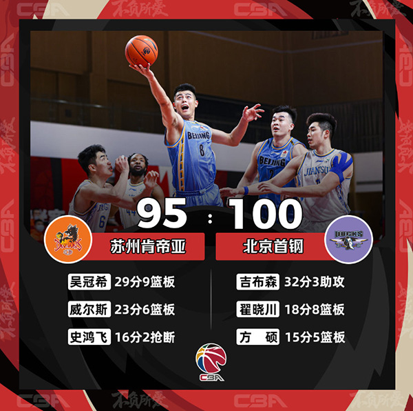末节,江苏连续冲击篮下得手,分差被迫近到3分。方硕打成2+1,吉布森三分轰进,又拉开9分差距。郑祺龙错失必进的扣篮,吉布森、方硕连连开火,北京拉开13分分差,基本奠定了胜势。威尔斯连得6分,但范子铭的关键补篮,为北京锁定胜局。最终北京队100-95击败江苏队,结束了自己的3连败。