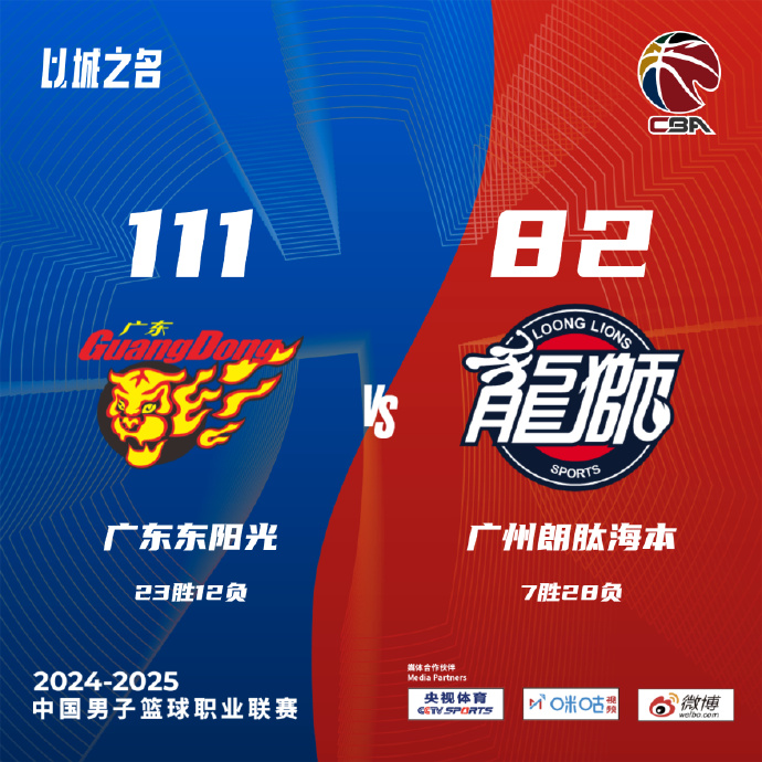 来源:24直播网01-24 22:19 24直播网讯:北京时间1月24日消息,2024-25赛季CBA常规赛进入第35轮角逐。坐镇主场的广东男篮经过四节较量以111-82战胜广州男篮,广州队吞下7连败。