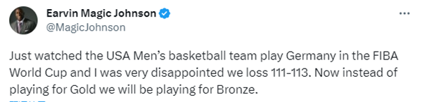 美国男篮出局后,湖人名宿魔术师约翰逊发推写道:刚刚看了国际篮联世界杯上美国对阵德国的比赛,我们111-113输了,我很失望。我们现在不再是去争夺金牌,而是铜牌了。