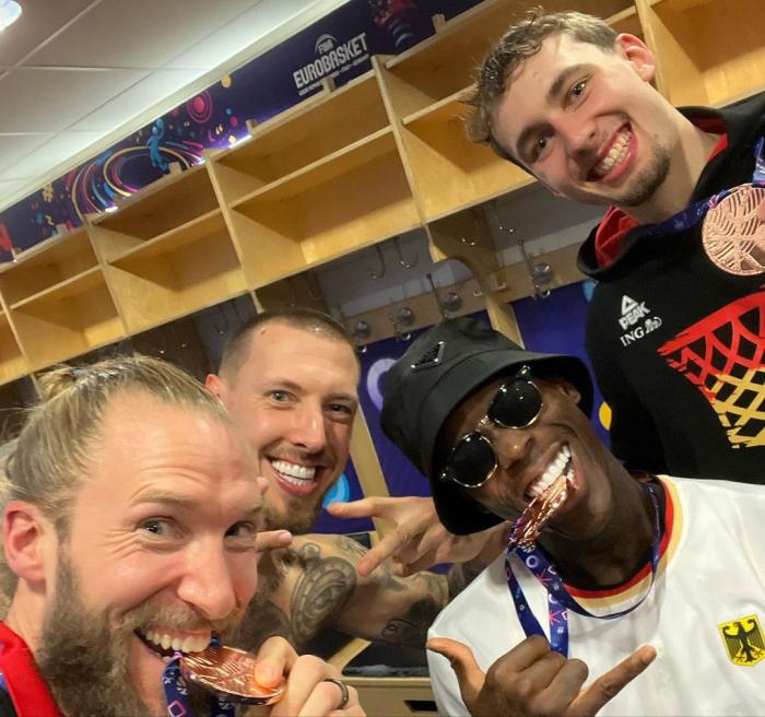 德国夺得铜牌就像夺冠似的,全队在更衣室合影庆祝,合影时施罗德躺在前排十分抢镜;施罗德还晒出他咬铜牌庆祝的画面,戴着墨镜和黑帽子咬铜牌,凸显一嘴大白牙;施罗德配文写道:德国,这是给你们的(THIS IS FOR YOU!)!没人相信我们……上帝相信。