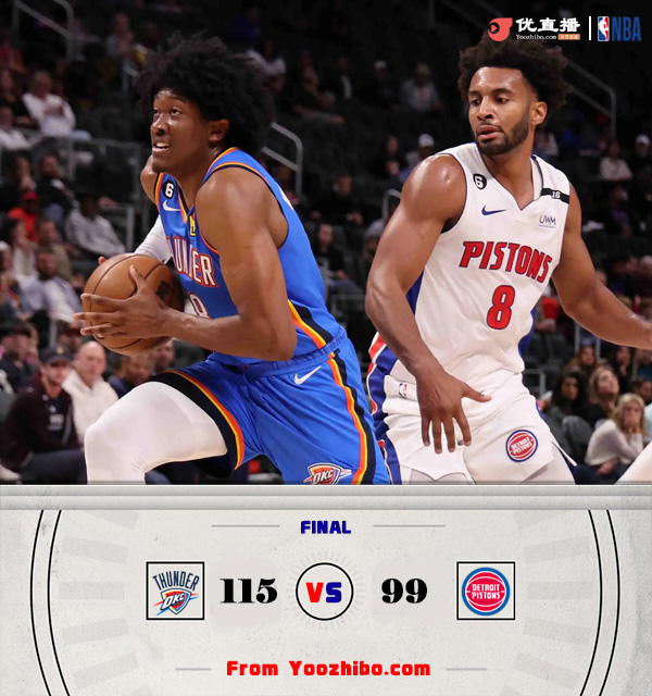 24直播网 10月12日讯 NBA季前赛今日继续,活塞迎战雷霆。两队新赛季都将继续以锻炼新人为主。一开场,雷霆连中三分,活塞内外开花给出回应。巴格利伤退,活塞三分4连击领先4分结束首节。次节上来,双方依旧打得难解难分,比分交替领先,双方互送进攻高潮,活塞半场结束时57-54领先3分。易边再战,雷霆连续打出进攻高潮取得两位数优势,活塞顽强追赶,三节打完雷霆反超8分。第四节,雷霆持续发力将分差拉开到20分,活塞大势已去无力回天。最终,雷霆115-99击败活塞,取得胜利。