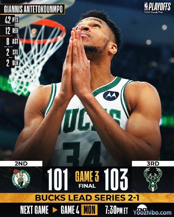 雄鹿(2-1):字母哥42分12篮板8助攻2抢断2盖帽,霍勒迪25分7板3助3断,马修斯3分4板,大洛13分10板2助2断,康诺顿11分8板,波蒂斯9分7板