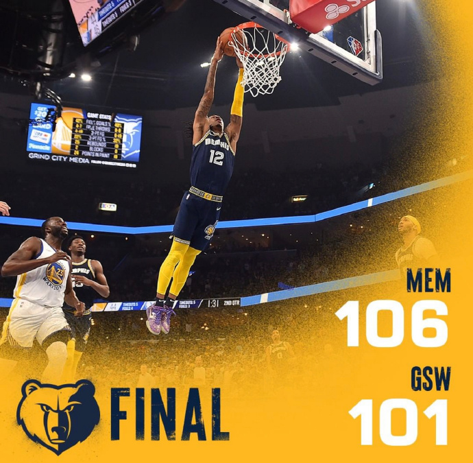 24直播网5月4日讯 灰熊今日继续坐镇主场迎来和勇士系列赛的G2之争,首战勇士1分险胜灰熊先拔头筹。首节之争灰熊开局非常积极连续制造对手失误并取得8-0的开局,也许是过度兴奋,狄龙随后防守端击打佩顿头部被吹罚二级恶意犯规直接驱逐,不过面对勇士的回暖反扑,莫兰特和小杰克逊首节合力攻下24分占据上风;次节灰熊状态大幅下滑,前6分钟仅得6分的表现相当糟糕,奈何勇士自己也没能抓住机会,即便后半节找回感觉但也错过最佳良机,莫兰特末段连拿7分为灰熊守住5分优势。第三节灰熊一度重新取得两位数领先,但勇士总能关键时刻拿分,末段一波13-3的攻势抹平比分进入末节决战,而末节也如预期那般僵持,库里和莫兰特的对决十足精彩,但莫兰特成为这波对决的胜者,他在最后时不足5分钟的时间里砍下15分帮助灰熊反超比分奠定胜局。最终,灰熊主场力克勇士扳回一城,总比分1-1打平。