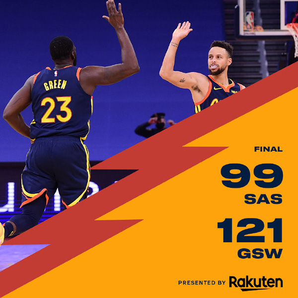 24直播网1月21日讯 NBA常规赛,勇士今日迎战马刺,前者上场比赛逆转湖人暂列西部第七位,而后者则是两连胜排名西部第五,比赛上来同时率先进入状态取得领先,分差也是逐渐达到两位数,次节开局马刺稍有反扑,但此后勇士及时调整,分差更是直接被扩大到二十分以上。易边再战,勇士始终保持着场上的领先优势,马刺没有获得任何机会,比赛早早失去悬念,最终勇士大胜马刺迎来连胜。