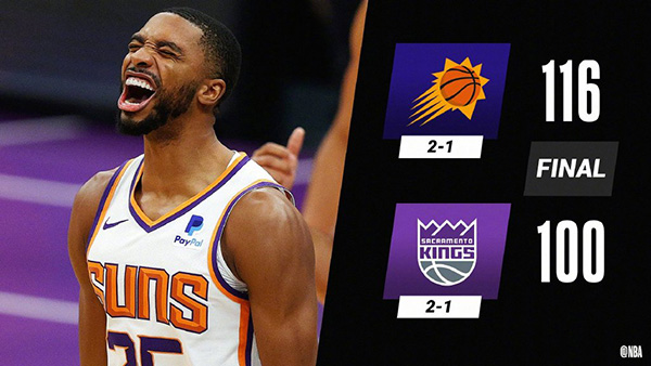 太阳:布里奇斯22分7篮板、克劳德2分3篮板、艾顿11分15篮板4助攻、布克20分5篮板5助攻、保罗8分4篮板12助攻、卡梅隆-约翰逊21分、佩恩7分5篮板6助攻2抢断、卡明斯基11分2篮板2助攻、加洛韦9分、卡特5分