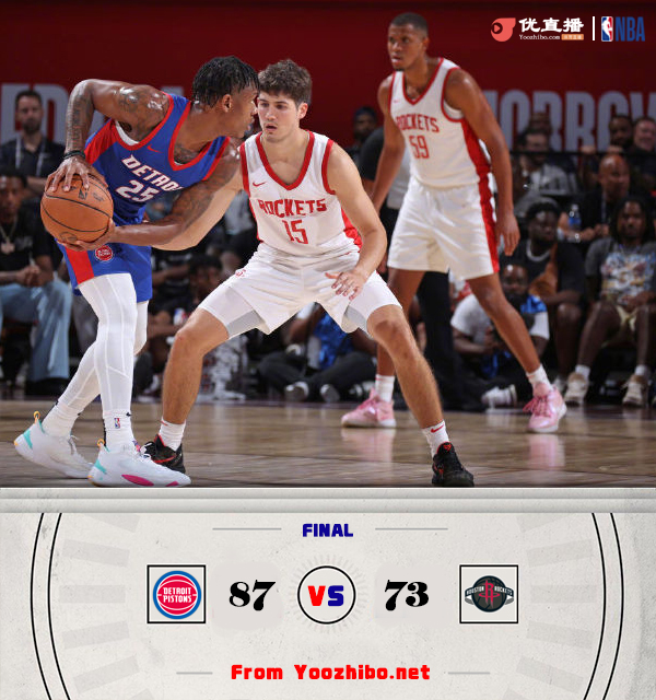 24直播网 7月16日讯 NBA夏季联赛,火箭主场对阵活塞。比赛开始,双方进攻端都比较慢热,谢泼德上篮为火箭开局,双方打了半节各自仅得6分,随后火箭抓住机会一波9-0小高潮反超比分,首节火箭领先3分,次节双方还是找不到进攻状态,惠特摩尔还是没有运动战进球,双方展开拉锯战,丹尼斯-詹金斯里突外投扛起活塞进攻,半场活塞反超1分。下半场,双方进攻端终于找回状态展开拉锯战,37号秀克林特曼接连取分,而AJ-格里芬也找到手感单节砍下9分回应,惠特摩尔终于有运动战进球,三节火箭反超1分,末节活塞上来12-0直接建立主动权,打了半节谢泼德罚篮终于破荒,随后双方又接连打铁,活塞还是能掌握住双位数领先,最终活塞87-73力克火箭。