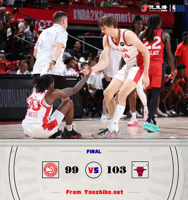 24直播网 7月20日讯 NBA夏季联赛,老鹰对阵公牛。选秀大会上老鹰摘得状元秀里萨谢,而公牛拿到11号秀布泽利斯。本场比赛里萨谢缺阵。比赛开始,公牛率先发力打出9-2开局,随后老鹰接连三分追分,斯图尔特手感火热外线能给出回应拉开双位数领先,首节公牛领先7分,次节双方展开拉锯战,菲利普斯接连扔进三分,公牛越打越好,一波10-3领先到15分。下半场,双方你来我往,公牛还是保持十几分领先,温德勒里突外投连砍6分带领老鹰一波8-2追至个位数分差,三节公牛还领先8分,末节老鹰开始追分,鲍登成为替补奇兵,老鹰9-0一度反超比分,但斯图尔特接连三分止血,双方展开胶着拉锯战,关键时刻华莱士和鲍登又接连扔三分反超2分,斯图尔特两罚再追平,双方96平进入加时。加时赛率先得到7分的球队获胜,菲利普斯三分命中后温德勒迅速回应,布泽利斯两罚后斯图尔特抛投绝杀,最终公牛加时103-99险胜老鹰。