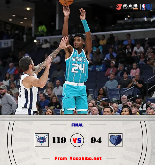 24直播网10月11日讯 NBA季前赛,灰熊对阵黄蜂。上半场,双方势均力敌,比分交替领先,黄蜂外线开火三分7连击取得两位数领先,灰熊连中三分努力追赶,半场战罢黄蜂62-49领先灰熊。易边再战,灰熊奋力反击打出12-0的攻击波,灰熊2记三分稳住局势,末节黄蜂一波9-1再度扩大优势分差,灰熊进攻端命中率下降,黄蜂越战越勇。最终,黄蜂119-94大胜灰熊。