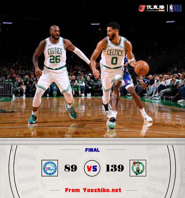 24直播网10月13日讯 NBA季前赛,凯尔特人对阵76人。凯尔特人主力除波尔津吉斯因伤缺阵外悉数出战,76人则轮休了全部主力。比赛开始,凯尔特人率先发力,多点开花很快取得两位数领先,76人替补攻防两端跟不上对手的节奏,绿军越战越勇将优势扩大到20分以上,次节双方大打对攻,凯尔特人牢牢保持着20分左右的领先,半场战罢凯尔特人71-48领先。易边再战,双探花率队将分差拉开到30分以上,76人无力招架,末节分差一度来到50分以上,最终,凯尔特人139-89狂胜76人50分。