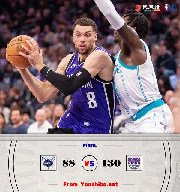 24直播网2月25日讯 NBA常规赛激战正酣,国王主场迎战黄蜂,两队上场均遭遇大败,国王目前28胜28负暂列西部第10,黄蜂14胜41负位列东部倒数第二。首节开打后布里奇斯连投带罚接连取分,黄蜂开局发力早早占优,拉文连中三分强势回应,国王稳扎稳打后来居上,首节结束时国王已经领先11分,次节回来,黄蜂进攻滞涩追分乏力,拉文手感依旧予取予求,德罗赞外线续上火力,半场战罢,国王确立20分优势。短暂休整后黄蜂突然发力回敬10-2小高潮,穆雷连投带补稳住局势,三节结束后国王依然领先16分,末节上来,拉文无人可挡再下三分雨,比赛分差过大提前失去悬念,最终国王130-88大胜对手。