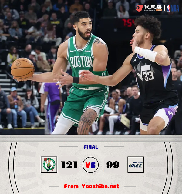 24直播网讯北京时间3月22日讯 NBA常规赛,凯尔特人对阵爵士,凯尔特人目前3连胜稳居东部第二,爵士西部垫底,上场比赛击败奇才。开场没多久凯尔特人就在波尔津吉斯和塔图姆的带领下打出攻势取得两位数领先,爵士开局手感不错但没能延续。第二节爵士轮换阵容首先发起反击缩小分差,凯尔特人外线轮番轰进三分稳住局面,随后爵士继续追分在半场结束时将分差缩小到个位数。易边再战,塞克斯顿神勇发挥帮助爵士一路追到只差2分,塔图姆和豪泽联手一波13-0再度将比分拉开。最后一节凯尔特人牢牢掌控住场上局面,没有给爵士缩小分差的机会,最终凯尔特人121-99轻松击败爵士取得4连胜。