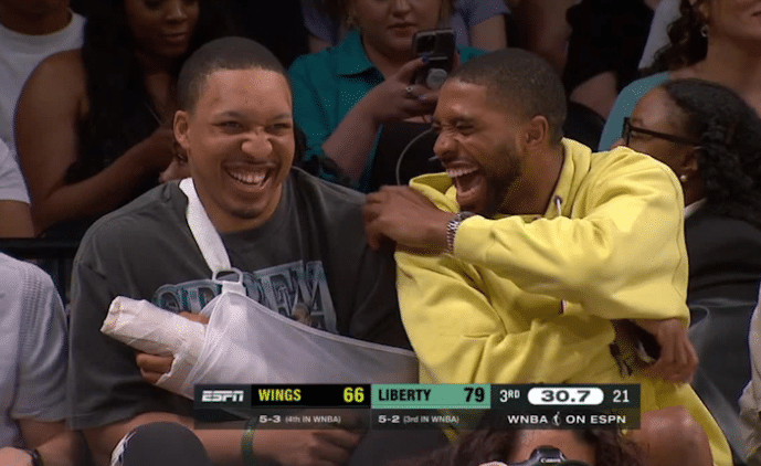 24直播网06月12日,绿军悍将格兰特-威廉姆斯术后亮相,并且和篮网新核布里奇斯一起观看WNBA,两人坐在一起都开怀大笑;其中格威在街头接受采访时,居然嘲讽热火马上就要被掘金淘汰了。