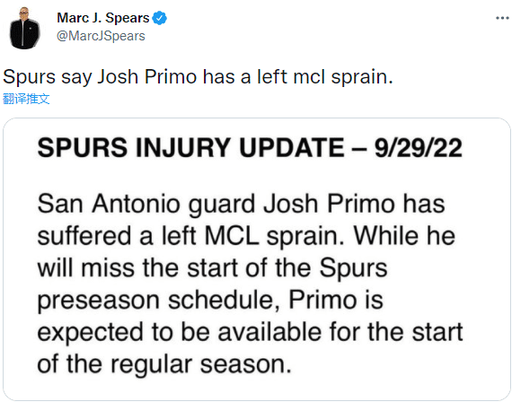 24直播网09月30日马刺官方宣布,球队二年级后卫约什-普里莫在训练营中遭遇左膝内侧韧带扭伤,将至少缺席初段的季前赛,他的伤势并不算严重,马刺预计普里莫将在常规赛初期复出。