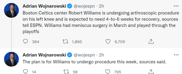 来源:24直播网09-21 12:0224直播网09月21日,据名记Woj报道,消息人士透露,波士顿凯尔特人的中锋罗伯特-威廉姆斯三世将在本周接受左膝关节镜手术,他预计需要4-6周的时间康复。绿军再次受到伤病打击,此前,绿军新援加里纳利因伤赛季报销。