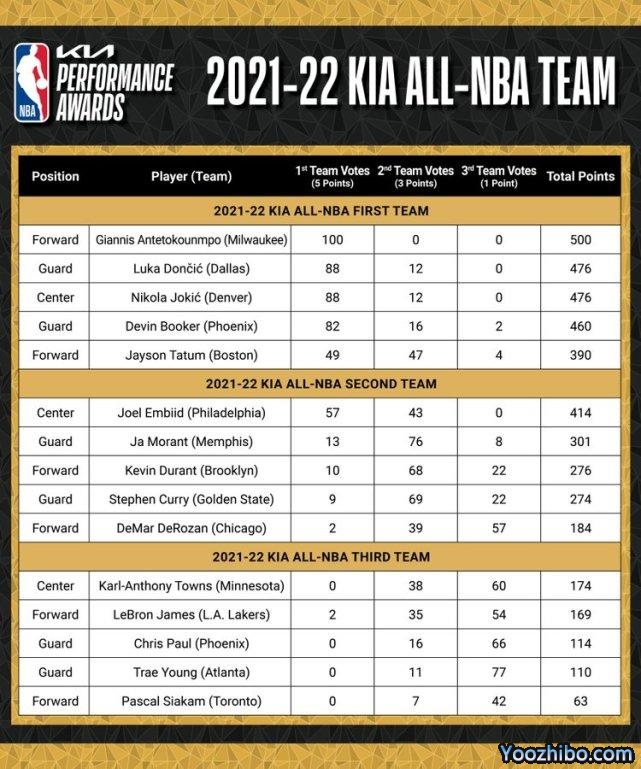 NBA官宣年度最佳阵容出炉:字母哥一阵 库里二阵詹皇三阵