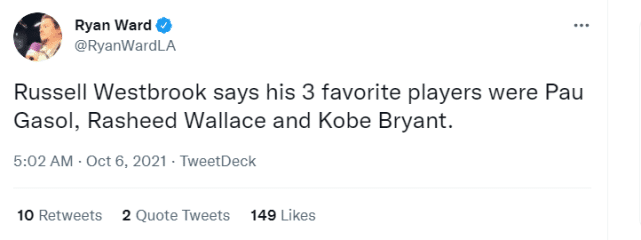 在今天的训练结束后,威斯布鲁克接受了采访,提到了大加索尔。大加索尔已经宣布正式退役,而湖人计划退役他的16号球衣。威少表示在科比之前,他最喜欢的球员就是大加索尔,并透露自己成长过程中最喜欢的三位球员是大加索尔、科比和拉希德-华莱士。