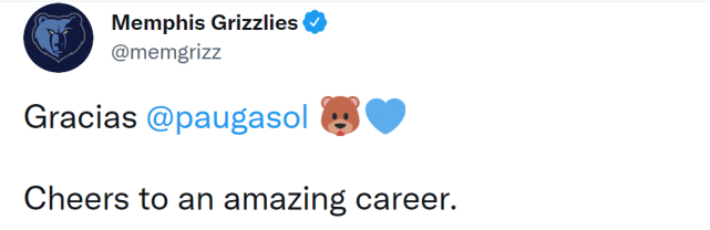 灰熊官媒写道:“谢谢@保罗-加索尔。为一段令人赞叹的生涯欢呼吧!”