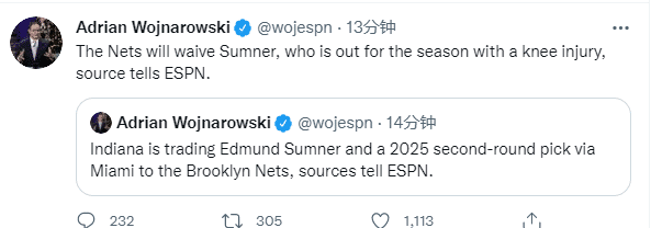 据ESPN名记沃纳罗斯基报道,篮网和步行者达成交易,步行者将埃德蒙-萨姆纳和2025年的次轮签交易至篮网,萨姆纳本赛季因为膝伤不会出战,篮网将会将其裁掉;步行者交易萨姆纳,之后步行者用训练营合同签下沃纳梅克。