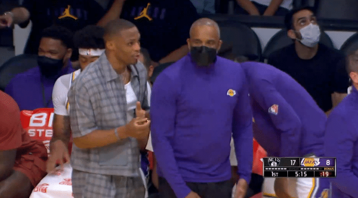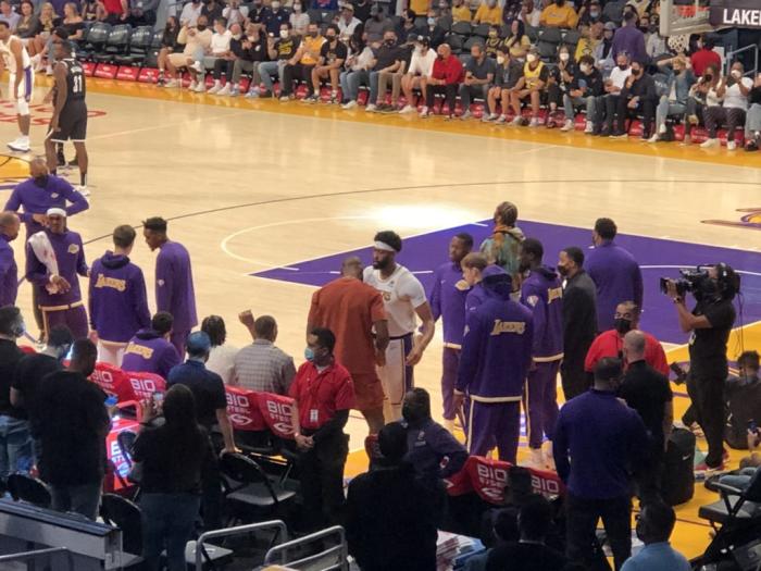 湖人场边暖心一幕!威少主动为浓眉让座,詹皇浓眉终于坐一起了