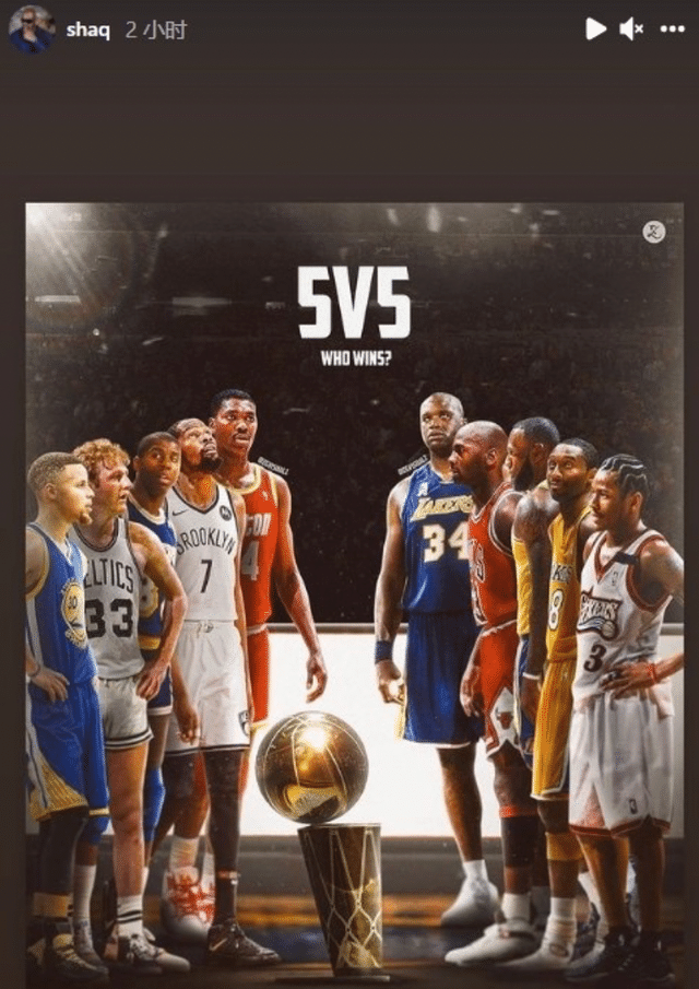 从图片中我们可以看到,左边是库里,拉里伯德,魔术师约翰逊,杜兰特和奥拉朱旺。右边则是奥尼尔本人,乔丹,詹姆斯,科比和艾弗森。如果这两个球队互相交锋,谁能拿到最终的总冠军呢?