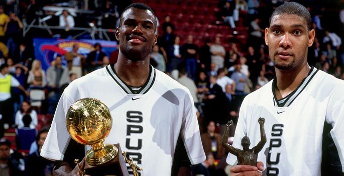 爵士先强后弱,马刺则一直坚挺。新秀季便入选最佳阵容第一队的邓肯愈发生猛,场均21.7分11.4个篮板2.52次盖帽,投篮命中率49.5%,是该季唯一在上述统计中都进入前十的球员,再次跻身最佳阵容第一队。马里奥•埃利进入首发后,马刺从开局6胜8负的萎靡中醒来,与爵士一样取得西部最好的31胜19负。双塔一出,谁与争锋,马刺在季后赛中更加可怕,晋级不商量,先后碾过森林狼、湖人和开拓者,仅耗时13场便杀入总决赛。