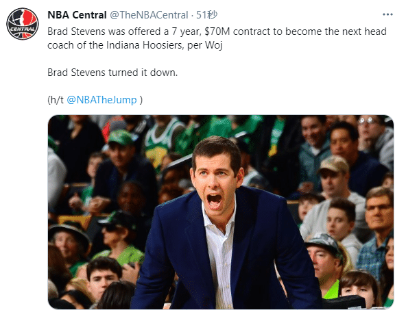 由于史蒂文斯拒绝了这份合同,最终印第安纳大学在三月时聘请了尼克斯助教伍德森,双方签下了一份6年长约;为了留在NBA执教,史蒂文斯果断拒绝7000万大合同;相比于大合同,史蒂文斯选择继续留在NBA,继续带领凯尔特人冲击总冠军。