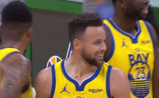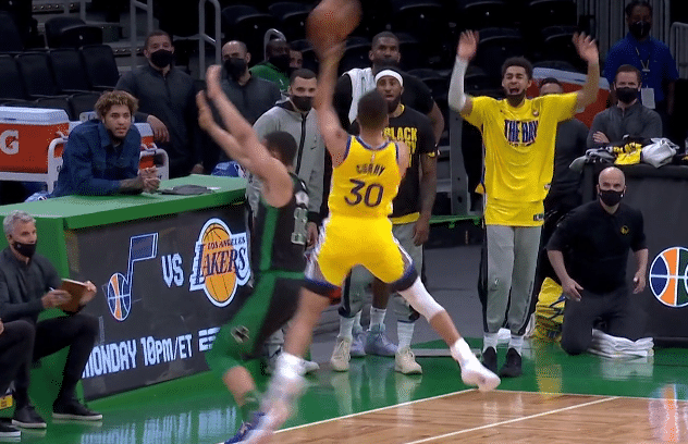 这是比赛进行到第二节还剩下2分钟的时候,塔图姆命中三分球,库里持球从后场推进,他面对格兰特-威廉姆斯的防守,连续的胯下运球之后试图晃开对手的防守,收球虚晃之后库里直接靠上格兰特-威廉姆斯,他踩着三分线的位置直接一个不规则的勾手投进,还造成了格兰特-威廉姆斯的犯规,成功打成2+1,加罚也命中。