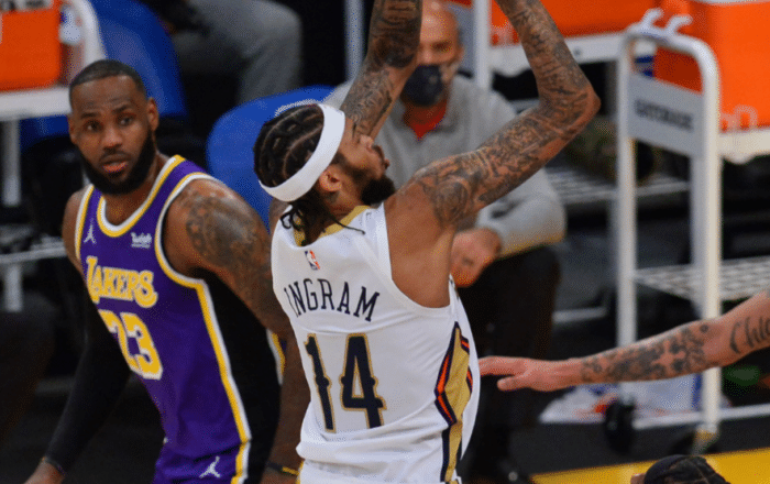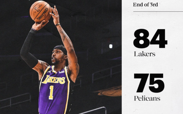 进入第三节,湖人再次打出了总冠军级别的防守强度,多次造成英格拉姆失误,单节让鹈鹕全队仅得到16分!三节战罢,湖人轻松反超10分!波普这赛季攻防两端让人印象深刻,在本场比赛之前,波普本赛季场均能以53%的命中率投进1.9个三分。而今天第三节,波普再次爆发,单节三分3投3中独得11分,而且还上演了一次抢断快攻暴扣,他的出色表现是湖人反超的关键!