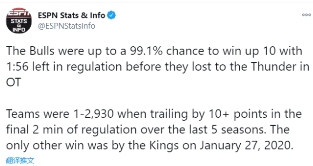 而作为落败者一方的拉文,此役也空砍纪录。他连续三场比赛轰下35+5+5追平队史纪录,此前的保持者是迈克尔·乔丹。此外,拉文也连续4场比赛得到30+且命中率在5成以上,成为96年乔丹之后第一位做到这一点的公牛球员。此外值得一提的是,第四节最后1分56秒公牛仍领先10分,公牛赢下比赛的概率一度高达99.1%。纵览过去5个赛季,第四节还剩2分钟时分差10+的比赛有2931场,领先方的战绩是2930胜1负。结果雷霆完成了大逆转!
