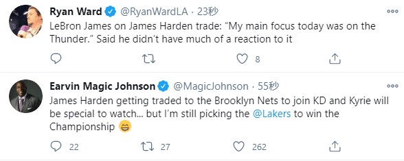 湖人名宿魔术师发推表示:哈登被交易到篮网,联手杜兰特和欧文特别值得关注,不过我依旧选择湖人赢得总冠军;36岁詹姆斯轻松带队大胜,魔术师还盛赞詹姆斯将是本赛季常规赛MVP。