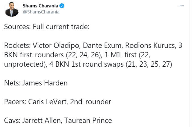 来源:24直播网01-14 08:5224直播网讯 北京时间1月14日,一笔关于哈登的四队大交易正式达成!篮网得到哈登,火箭得到奥拉迪波、埃克萨姆、库鲁茨、4个首轮和4次选秀互换权,步行者得到勒维尔和一个次轮签,骑士得到贾内特-阿伦和普林斯。