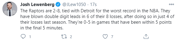 除此之外,猛龙本赛季在关键时刻的表现也非常糟糕。球队目前在最后5分钟双方差距在5分的胶着比赛中,战绩是尴尬的0胜5负!对于猛龙来说,失去多名关键球员之后,他们的关键球和稳定性下滑的确太严重了。