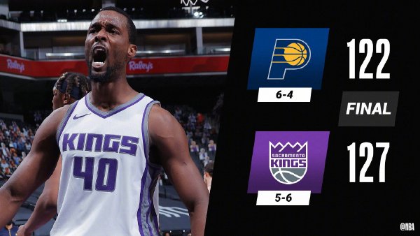 末节,霍尔姆斯和哈利伯顿连中3分,分差再次被扩大为10分。霍勒迪的三分球结束了步行者队本节得分荒,巴恩斯打成2+1,幸好麦克德莫特回敬3分,他的得分也突破了20分大关。奥拉迪波登场后连砍5分,小萨打三分,比分变为110平。最后5分钟,奥拉迪波一人连砍7分,但希尔德投中两记三分球,而福克斯上篮后国王领先了6分。还剩29.7秒,奥拉迪波扣篮,不过国王连续造犯规罚球保住胜局。最终,国王以127-122险胜步行者,结束两连败。