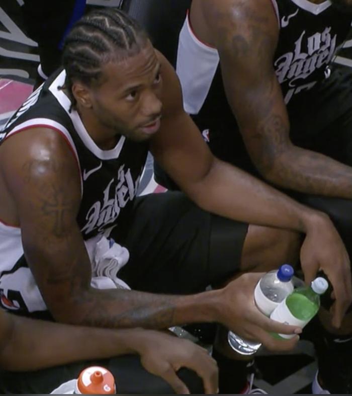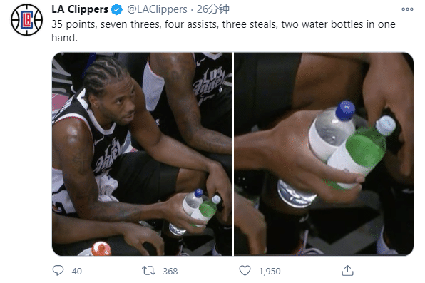 快船官方晒小卡坐在替补席单手紧紧握着两个矿泉水瓶的画面,并且写道:小卡轰下35分、投进7记三分球、4个助攻3个抢断和单手两个水瓶。