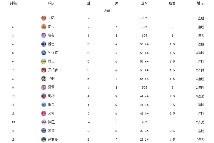 太阳今天击败了步行者,重新反超湖人战绩西部第一的位置。湖人昨天击败公牛,詹姆斯带队表现非常出色。快船昨天被勇士上演一波,领先22分被逆转。爵士战绩是5胜4负,他们的状态波动有些明显。独行侠依靠着小哈达威的爆发成功击败了魔术,一波3连胜排名急速上升。勇士昨天在库里的带领下完成了落后22分的大逆转,击败了快船。开拓者大胜国王,麦科勒姆表现抢眼。马刺今天通过加时赛险胜森林狼,波波维奇NBA执教第1900场里程碑赢球。