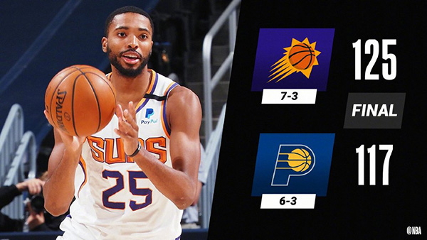 太阳(7-3):布里奇斯34分、布克25分7助、约翰逊16分、艾顿8分14板、保罗15分10助、克劳德10分8板、卡特10分。
